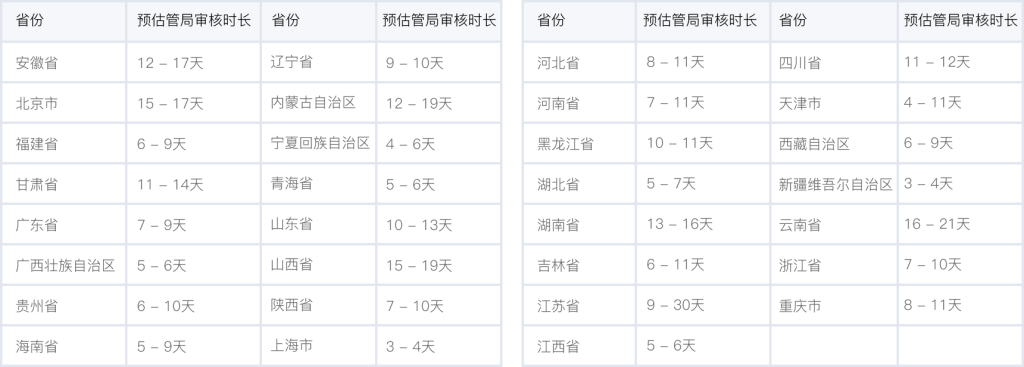 各個省管局預計審核時長,實際審核時長會根據備案場景有所不同,下表格僅供參考。詳情可查看 詳細規(guī)則。
